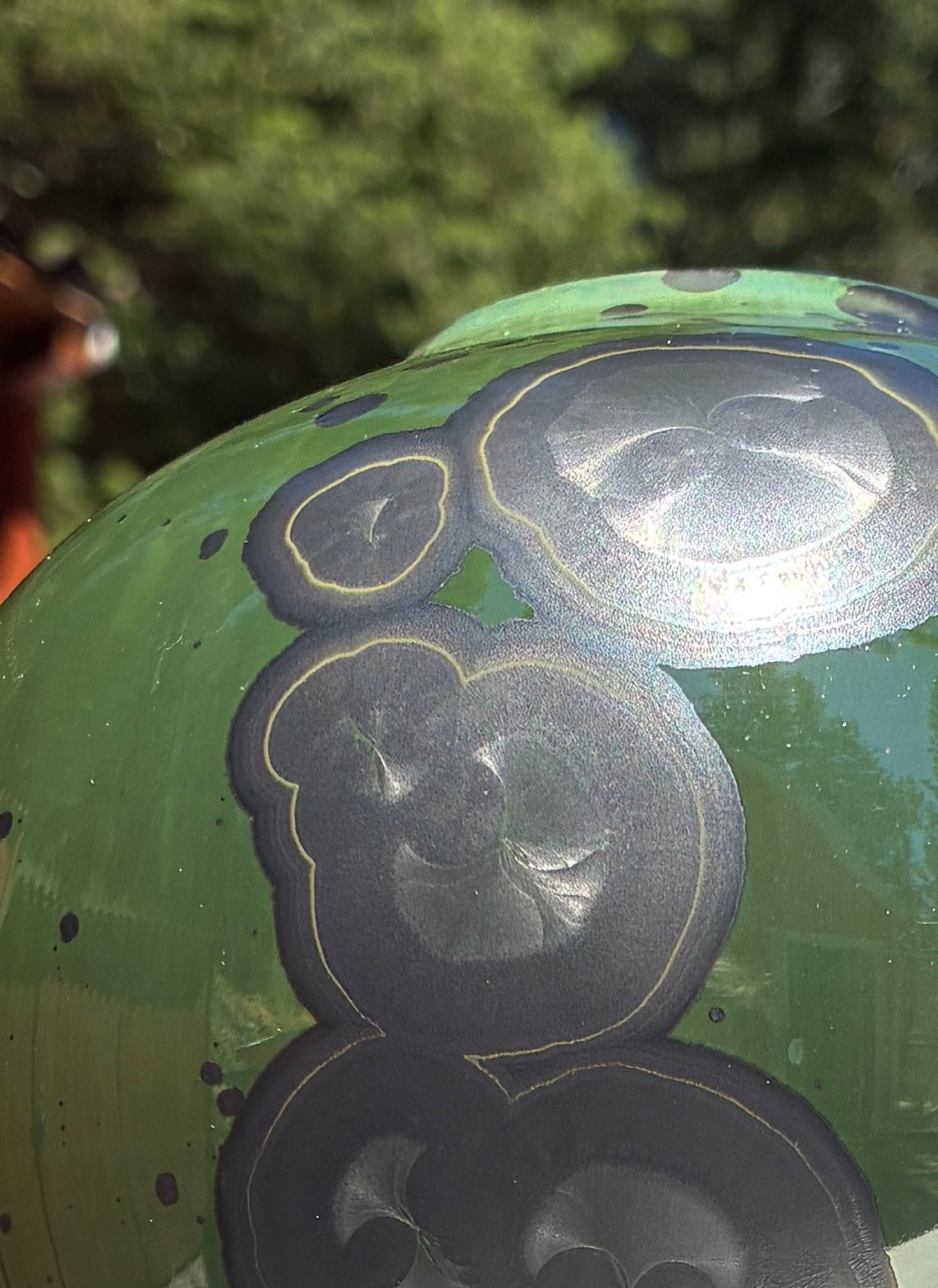 He’s settled into himself — confident now, after years of learning who he is and who he isn’t. The narrow foot and proud shoulders give him quiet stature, like someone who’s walked the halls long enough to stop trying to impress them. His mango glaze glows with the energy of youth, tapering into the calm of pale yellow near the base, where blue crystals rise like late-night ideas finally taking shape. There’s history in the way he holds light — not perfect, but assured, grounded, content to stand among others and still be his own. Please note: a minor firing crack is present on the underside of the foot. It does not affect the structure or the vessel’s ability to hold water and is not visible during normal display.