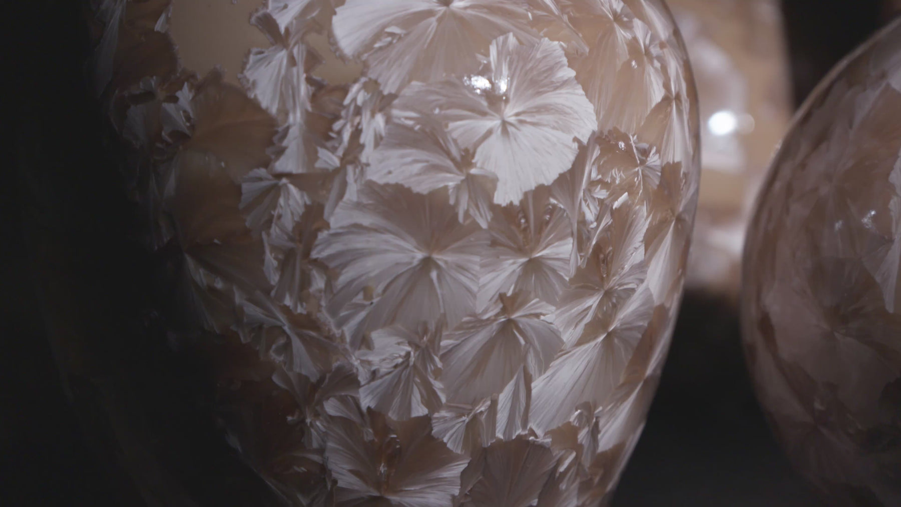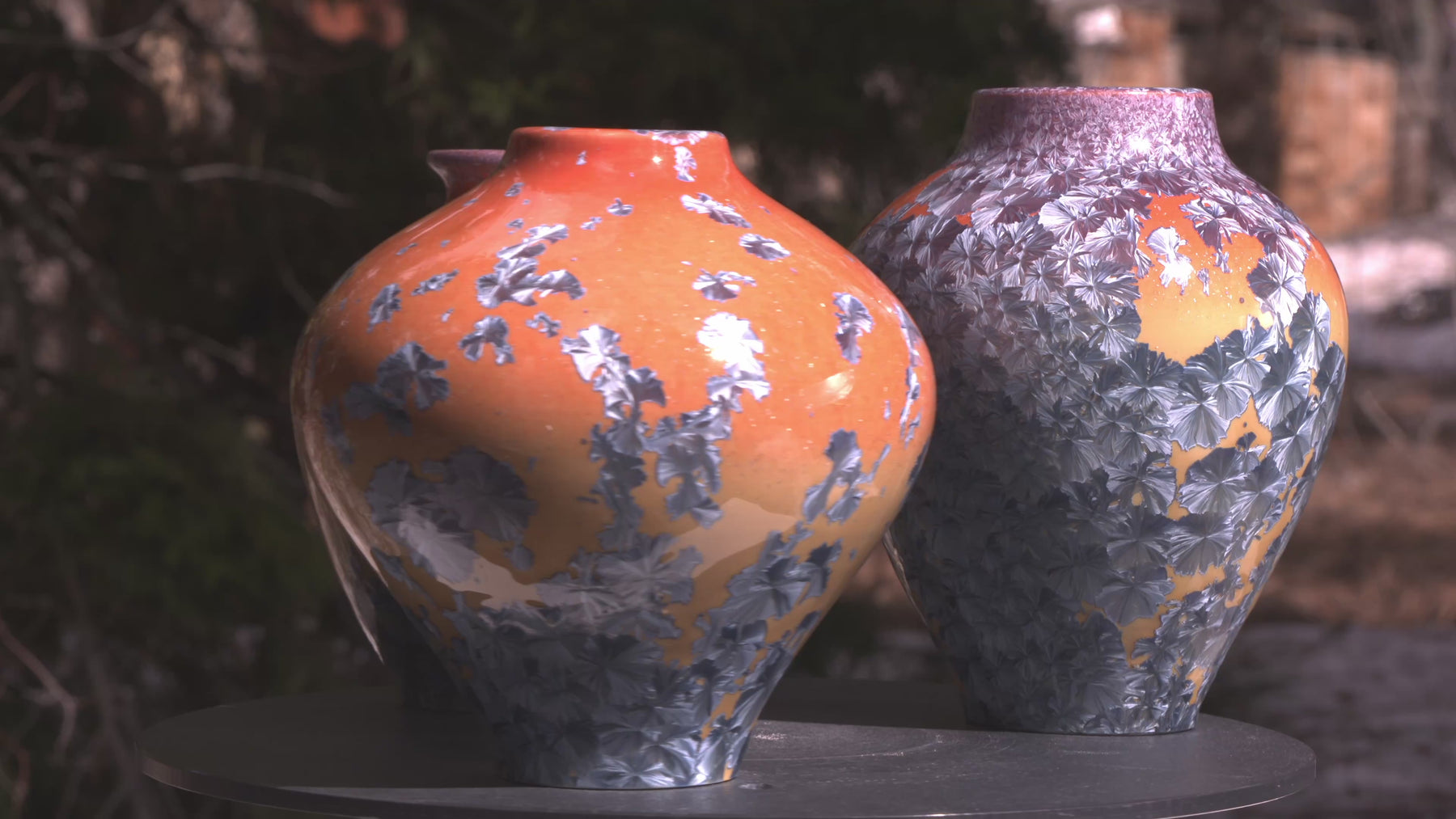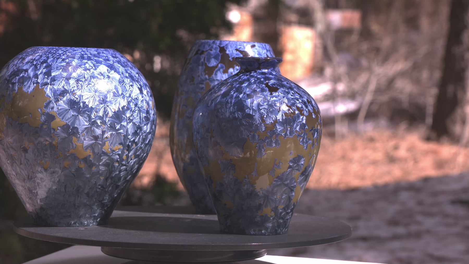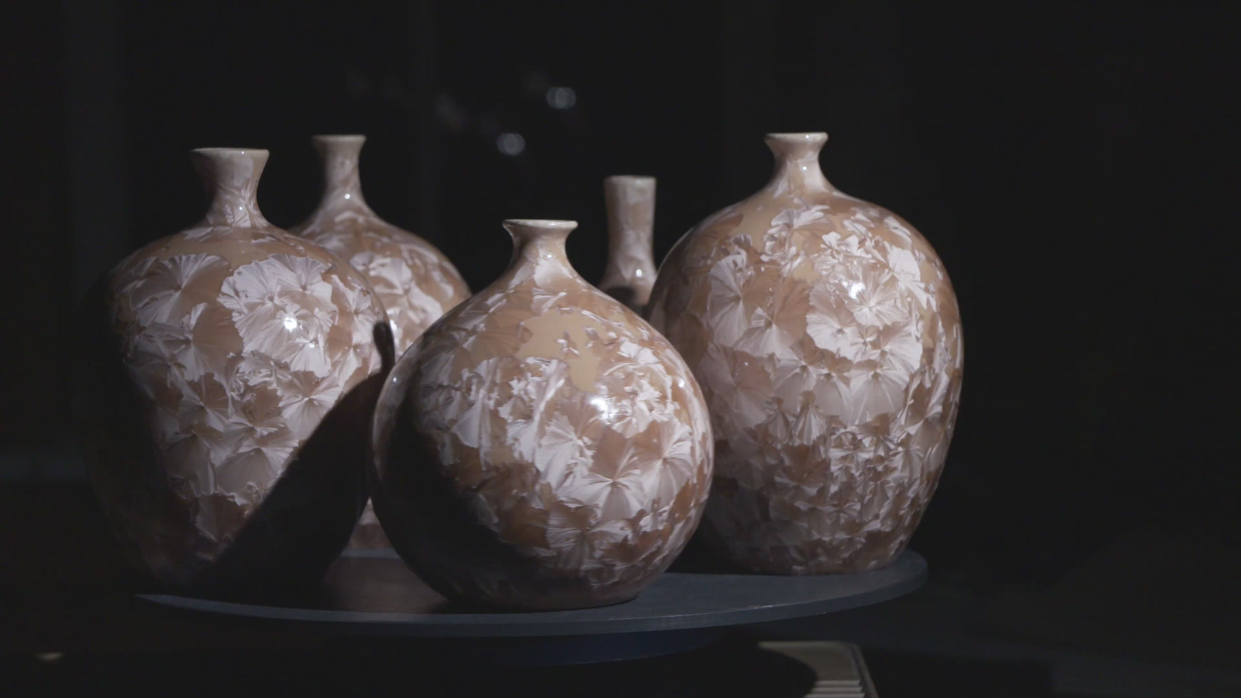 Each piece carries its own pattern of drifted crystals, suspended like fragments of ice over desert sand. Together, they form a harmonious landscape — distinct, yet bound by the same molten chemistry.