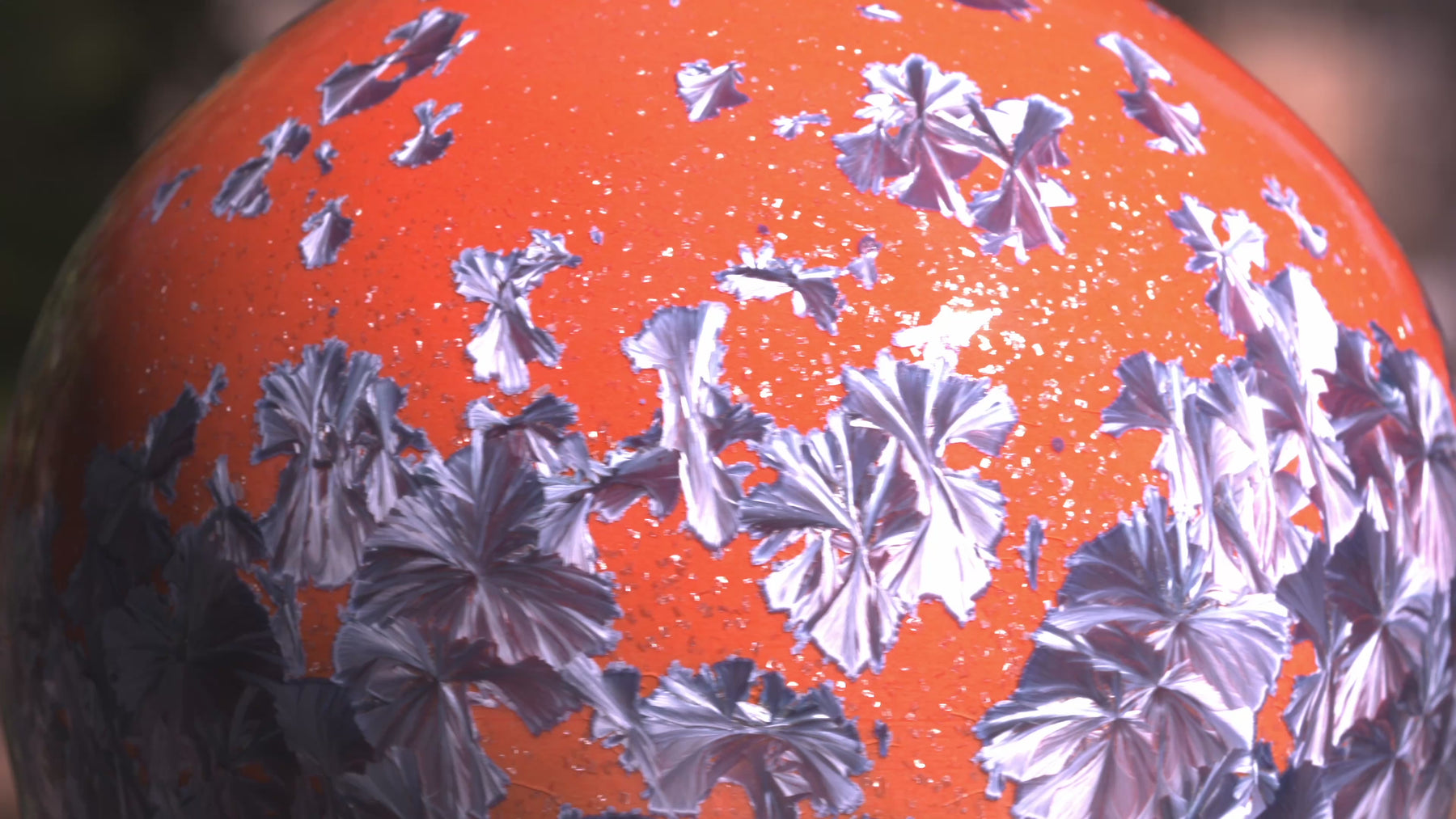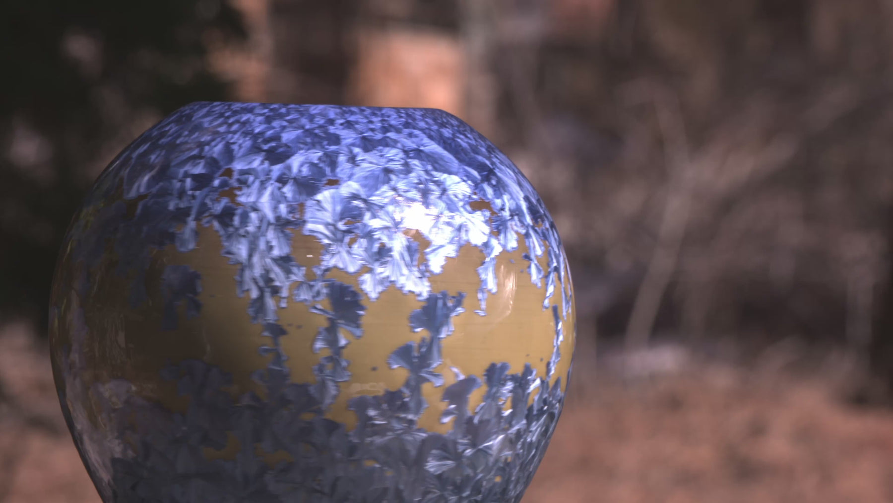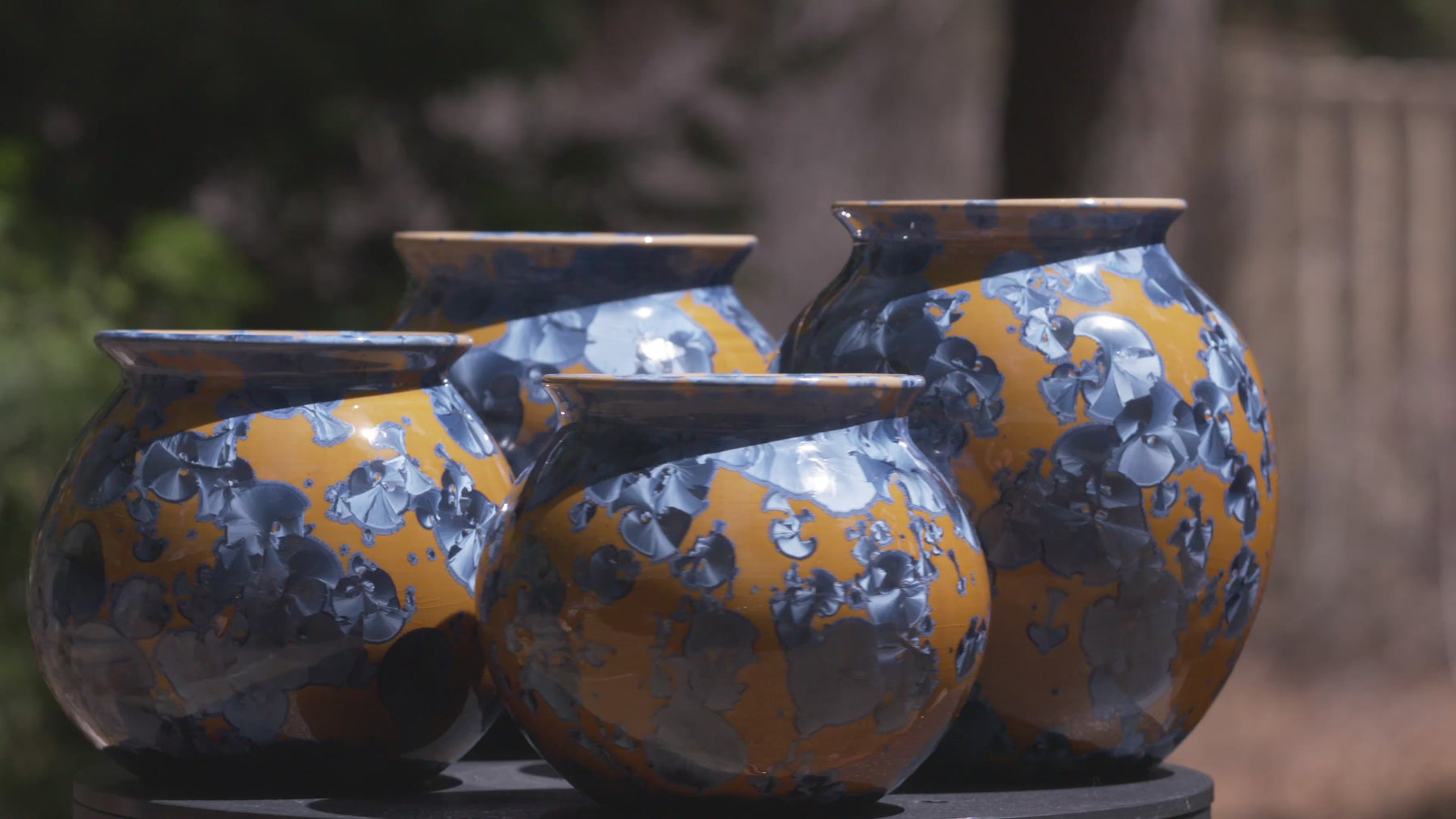 Each piece carries its own pattern of drifted crystals, suspended like fragments of ice over desert sand. Together, they form a harmonious landscape — distinct, yet bound by the same molten chemistry.