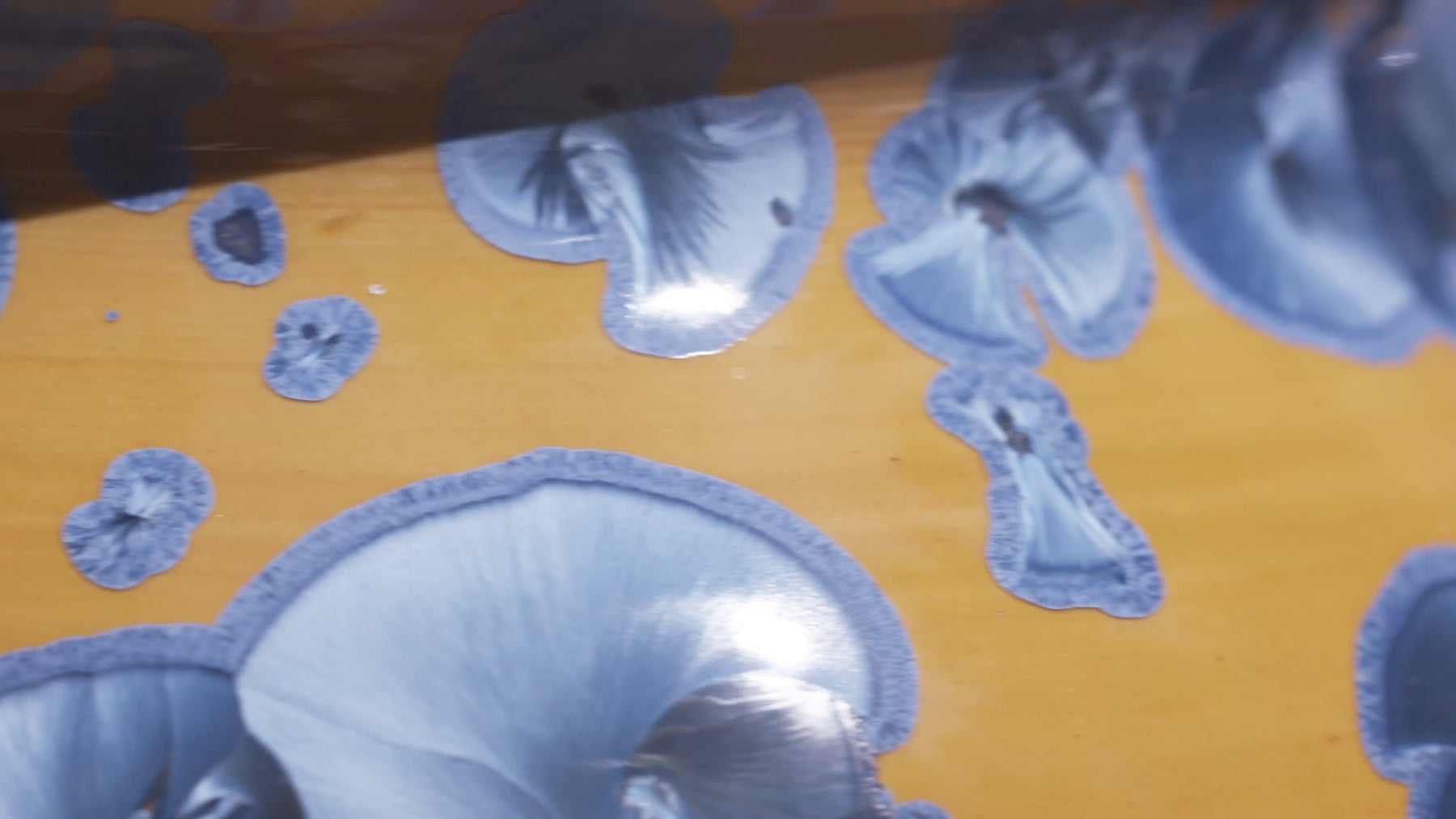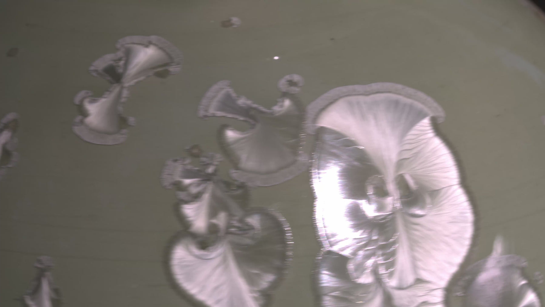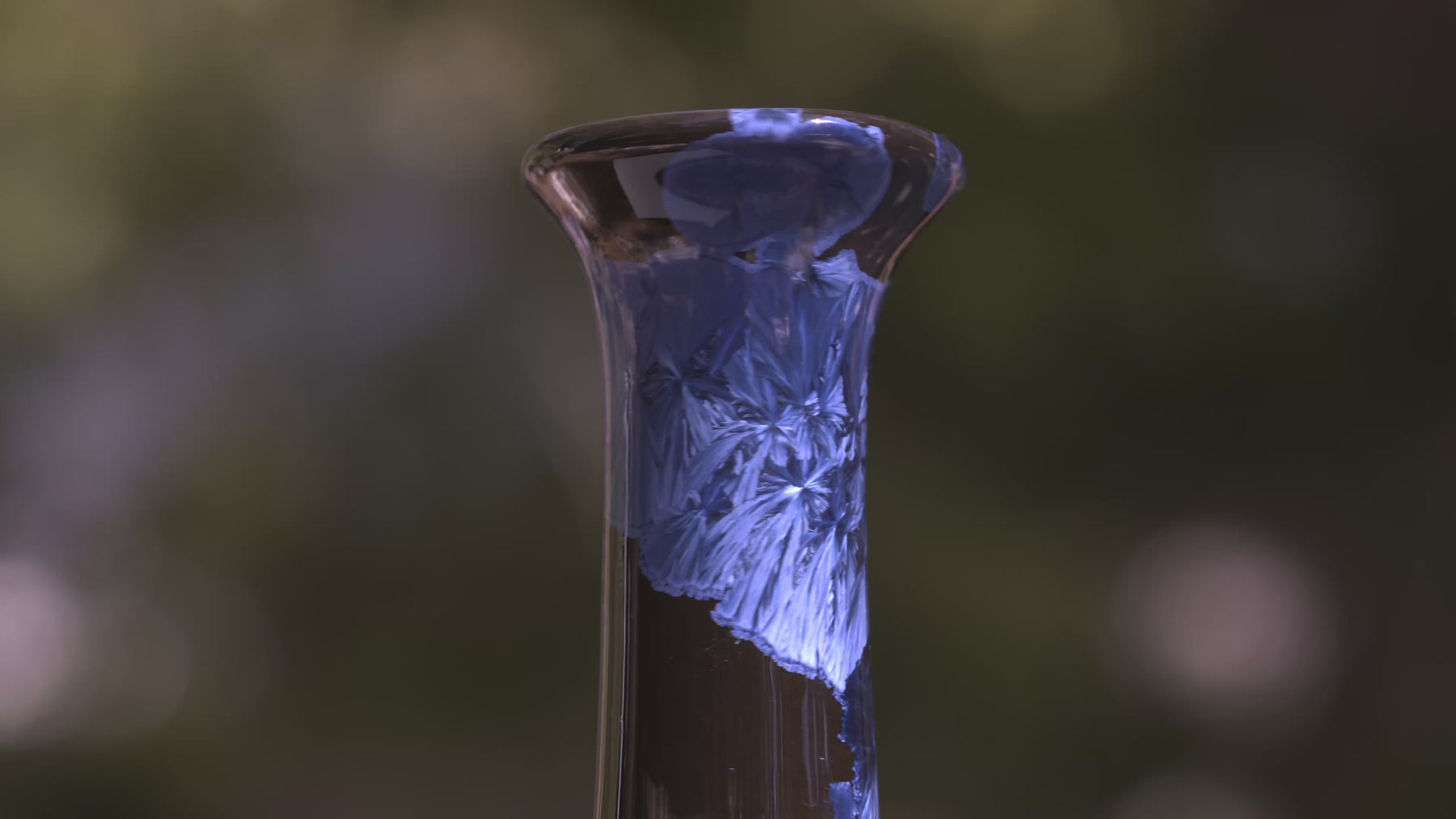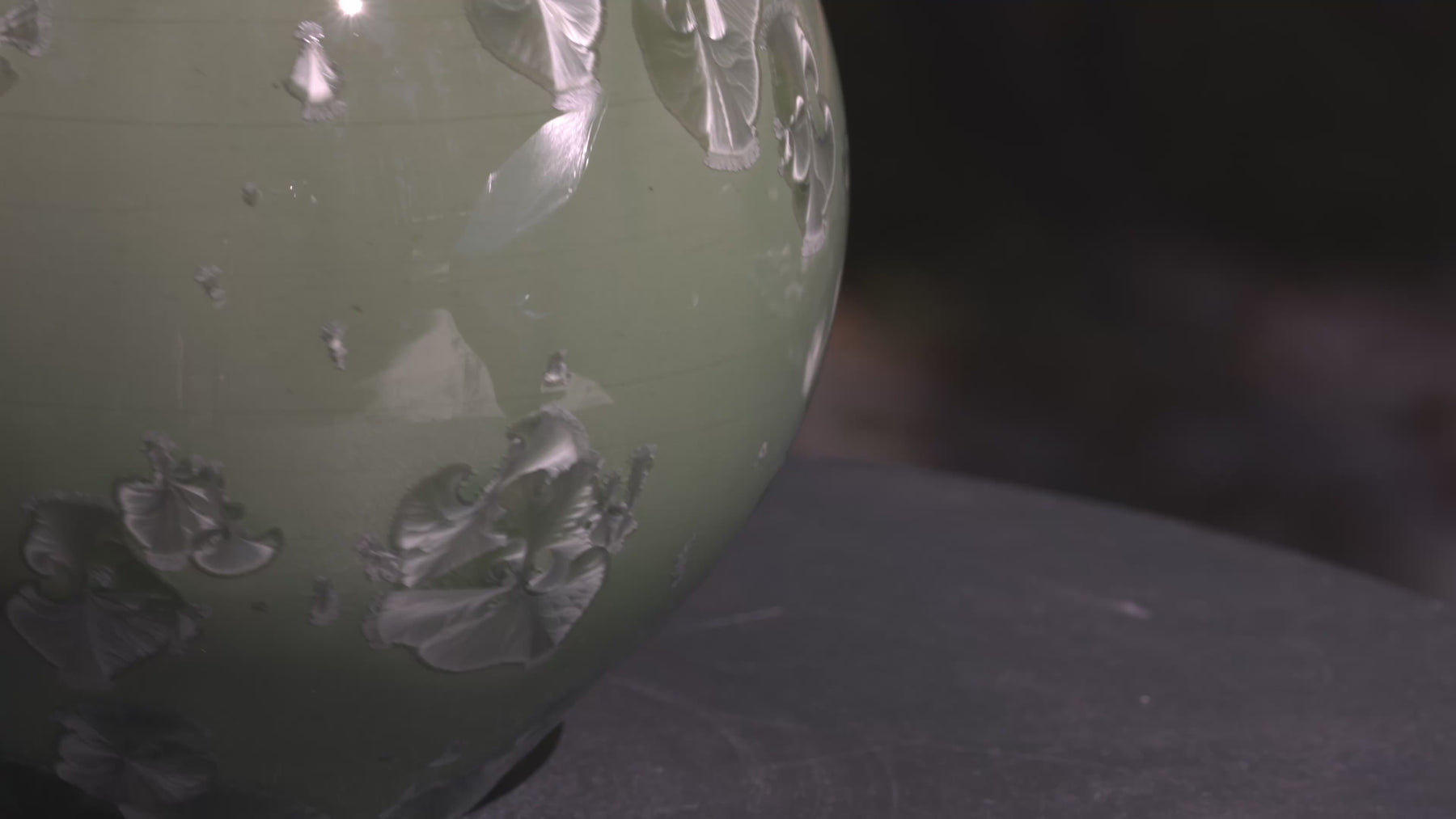 Each piece carries its own pattern of drifted crystals, suspended like fragments of ice over desert sand. Together, they form a harmonious landscape — distinct, yet bound by the same molten chemistry.