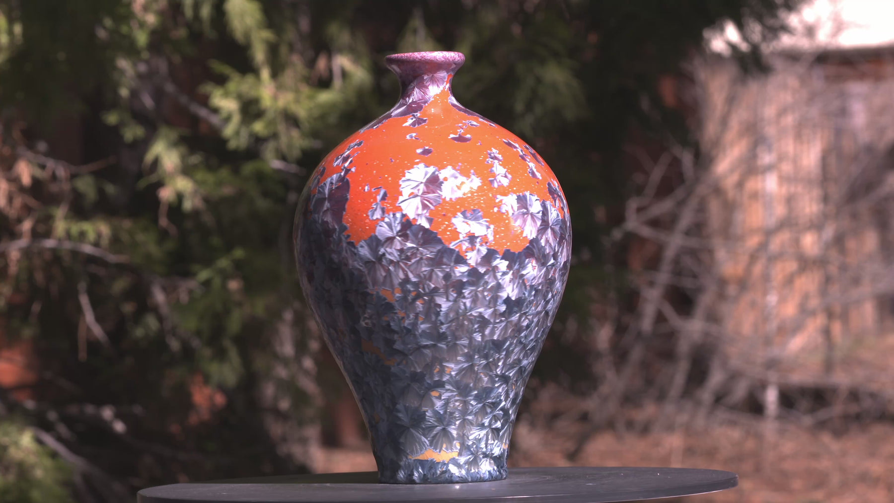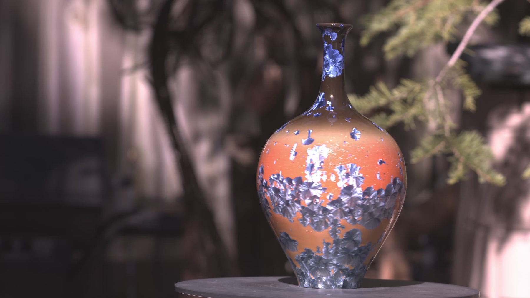 He was never meant to blend in. The form is classic — a narrow base, full body, and elegant flute — but the surface burns with contradiction. From obsidian black at the rim, the glaze flares into molten orange and fades to a pale glow at the base, a sunset that refuses to end quietly. Blue crystals scatter across the field like sparks breaking rank. This vessel doesn’t chase balance — it thrives on the edge of it, proof that beauty often lives in the tension between order and unrest.