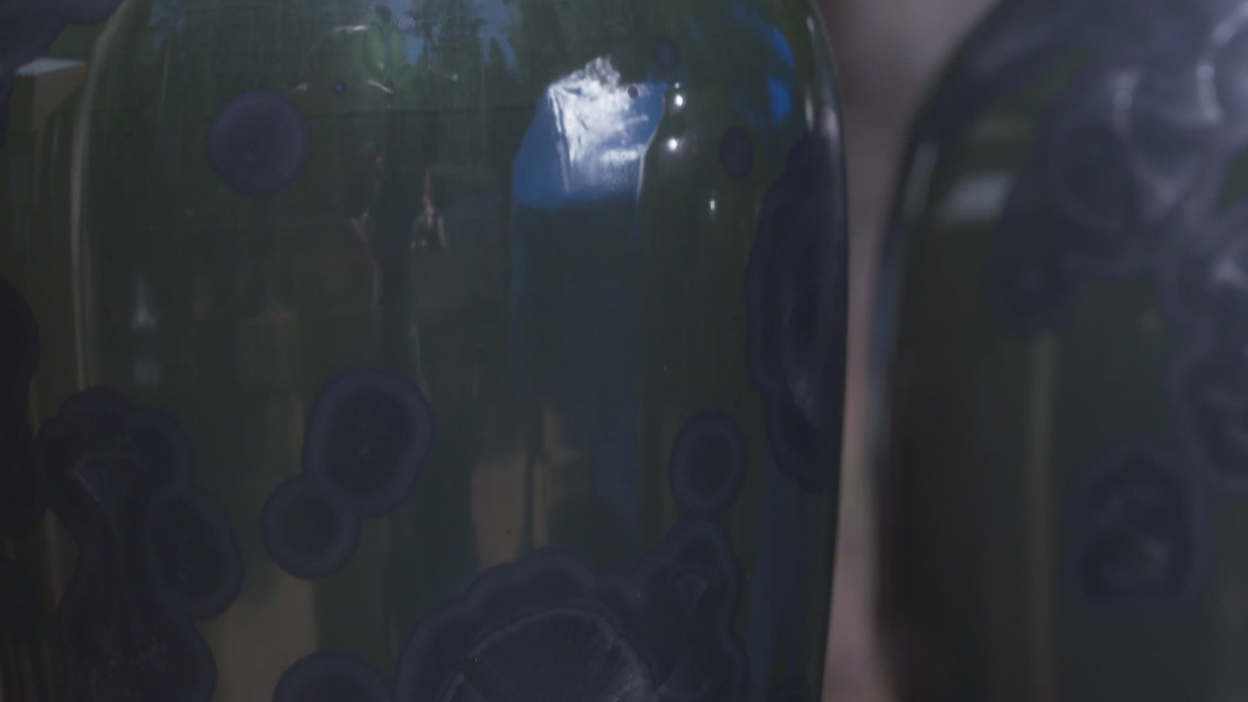 Three kin in shadow and sheen: porcelain forms dressed in Patrick's signature deep green with matte-black crystalline blooms. Light skims the surfaces like tempered glass, revealing quiet depth and a shared stance—each piece complete on its own, truest together.